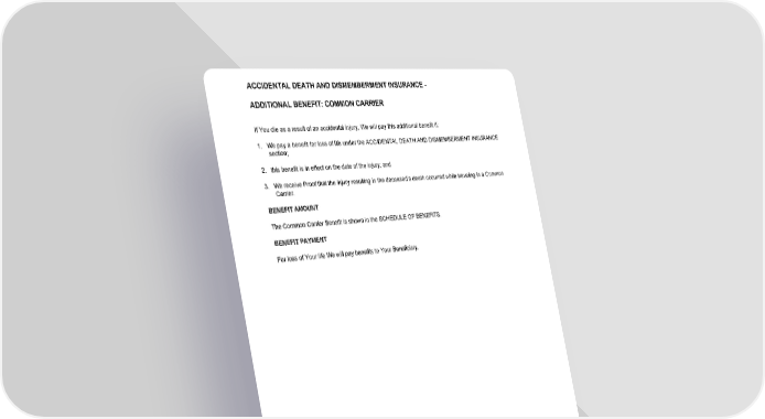 ACCIDENTAL DEATH AND DISMEMBERMENT INSURANCE - ADDITIONAL BENEFIT: COMMON CARRIER GCERT2000 add/cc 54 If You die as a result of an accidental injury, We will pay this additional benefit if: 1. We pay a benefit for loss of life under the ACCIDENTAL DEATH AND DISMEMBERMENT INSURANCE section; 2. this benefit is in effect on the date of the injury; and 3. We receive Proof that the injury resulting in the deceased’s death occurred while traveling in a Common Carrier. BENEFIT AMOUNT The Common Carrier Benefit is shown in the SCHEDULE OF BENEFITS. BENEFIT PAYMENT For loss of Your life We will pay benefits to Your Beneficiary.