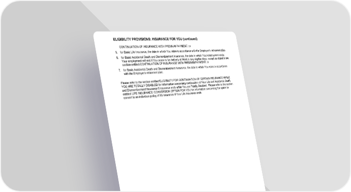 ELIGIBILITY PROVISIONS: INSURANCE FOR YOU (continued) GCERT2000 34 e/ee CONTINUATION OF INSURANCE WITH PREMIUM PAYMENT; or 5. for Basic Life Insurance, the date in which You retire in accordance with the Employer’s retirement plan. 6. for Basic Accidental Death and Dismemberment Insurance, the date in which Your employment ends; Your employment will end if You cease to be Actively at Work in any eligible class, except as stated in the section entitled CONTINUATION OF INSURANCE WITH PREMIUM PAYMENT; or 7. for Basic Accidental Death and Dismemberment Insurance, the date in which You retire in accordance with the Employer’s retirement plan. Please refer to the section entitled ELIGIBILITY FOR CONTINUATION OF CERTAIN INSURANCE WHILE YOU ARE TOTALLY DISABLED for information concerning continuation of Your Life and Accidental Death and Dismemberment Insurance if insurance ends while You are Totally Disabled. Please refer to the section entitled LIFE INSURANCE: CONVERSION OPTION FOR YOU for information concerning the option to convert to an individual policy of life insurance if Your Life Insurance ends.