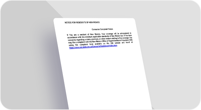 NOTICE FOR RESIDENTS OF NEW MEXICO GCERT2000 notice/nm-ccn 15 Consumer Complaint Notice If You are a resident of New Mexico, Your coverage will be administered in accordance with the minimum applicable standards of New Mexico law. If You have concerns regarding a claim, premium, or other matters relating to this coverage, You may file a complaint with the New Mexico Office of Superintendent of Insurance (OSI) using the complaint form available on the OSI website and found at: https://www.osi.state.nm.us/ConsumerAssistance/index.aspx .