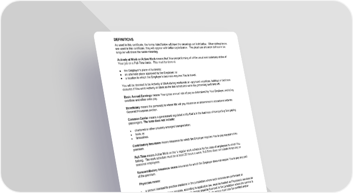 DEFINITIONS GCERT2000 29 def As used in this certificate, the terms listed below will have the meanings set forth below. When defined terms are used in this certificate, they will appear with initial capitalization. The plural use of a term defined in the singular will share the same meaning. Actively at Work or Active Work means that You are performing all of the usual and customary duties of Your job on a Full-Time basis. This must be done at: ● the Employer’s place of business; ● an alternate place approved by the Employer; or ● a location to which the Employer’s business requires You to travel. You will be deemed to be Actively at Work during weekends or -approved vacations, holidays or business closures if You were Actively at Work on the last scheduled work day preceding such time off. Basic Annual Earnings means Your gross annual rate of pay as determined by Your Employer, excluding overtime and other extra pay. Beneficiary means the person(s) to whom We will pay insurance as determined in accordance with the General Provisions section. Common Carrier means a government regulated entity that is in the business of transporting fare paying passengers. The term does not include: ● chartered or other privately arranged transportation; ● taxis; or ● limousines. Contributory Insurance means insurance for which the Employer requires You to pay any part of the premium. Full-Time means Active Work on the ’s regular work schedule for the class of employees to which You belong. The work schedule must be at least 20 hours a week. Full-Time does not include temporary or seasonal employees. Noncontributory Insurance means insurance for which the Employer does not require You to pay any part of the premium . Physician means: ● a person licensed to practice medicine in the jurisdiction where such services are performed; or ● any other person whose services, according to applicable law, must be treated as Physician's services for purposes of the Group Policy. Each such person must be licensed in the jurisdiction where the service is performed and must act within the scope of that license. Such person must also be certified and/or registered if required by such jurisdiction. The term does not include : ● You; ● Your Spouse; or ● any member of Your immediate family including Your and/or Your spouse’s parents; children (natural, step or adopted); siblings; grandparents; or grandchildren.