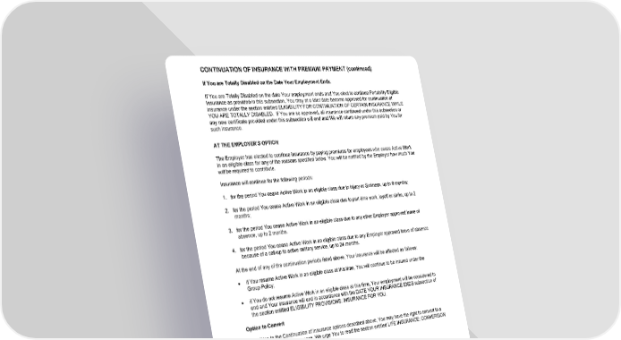 CONTINUATION OF INSURANCE WITH PREMIUM PAYMENT (continued) GCERT2000 39 coi-np If You are Totally Disabled on the Date Your Employment Ends. If You are Totally Disabled on the date Your employment ends and You elect to continue Portability Eligible Insurance as provided in this subsection, You may at a later date become approved for continuation of insurance under the section entitled ELIGIBILITY FOR CONTINUATION OF CERTAIN INSURANCE WHILE YOU ARE TOTALLY DISABLED . If You are so approved, all insurance continued under this subsection or any new certificate provided under this subsection will end and We will return any premium paid by You for such insurance. AT THE EMPLOYER’S OPTION The Employer has elected to continue insurance by paying premiums for employees who cease Active Work in an eligible class for any of the reasons specified below. You will be notified by the Employer how much You will be required to contribute. Insurance will continue for the following periods: 1. for the period You cease Active Work in an eligible class due to injury or Sickness, up to 9 months; 2. for the period You cease Active Work in an eligible class due to part-time work, layoff or strike, up to 2 months; 3. for the period You cease Active Work in an eligible class due to any other Employer approved leave of absence, up to 2 months. 4. for the period You cease Active Work in an eligible class due to any Employer approved leave of absence because of a call-up to active military service, up to 24 months. At the end of any of the continuation periods listed above, Your insurance will be affected as follows: ● if You resume Active Work in an eligible class at this time, You will continue to be insured under the Group Policy; ● if You do not resume Active Work in an eligible class at this time, Your employment will be considered to end and Your insurance will end in accordance with the DATE YOUR INSURANCE ENDS subsection of the section entitled ELIGIBILITY PROVISIONS: INSURANCE FOR YOU. Option to Convert In addition to the Continuation of Insurance options described above, You may have the right to convert to a policy of individual life insurance. We urge You to read the section entitled LIFE INSURANCE: CONVERSION OPTION FOR YOU. CONTINUATION OF ACCIDENTAL DEATH AND DISMEMBERMENT (AD&D) Special Rules For Massachusetts Residents 1. If Your AD&D Insurance ends due to a Plant Closing or Covered Partial Closing, such insurance will be continued for 90 days after the date it ends. 2. If Your AD&D Insurance ends because: · You cease to be in an Eligible Class; or · Your employment terminates for any reason other than a Plant Closing or Covered Partial Closing, such insurance will continue for 31 days after the date it ends. Continuation of Your AD&D Insurance under this subsection will end before the end of continuation periods shown above if You become covered for similar benefits under another plan.