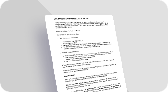 LIFE INSURANCE: CONVERSION OPTION FOR YOU GCERT2000 45 co/l/ee If Your Life Insurance ends or is reduced for any of the reasons stated below, You have the option to buy an individual policy of life insurance (“new policy”) from Us during the Application Period in accordance with the conditions and requirements of this section. This is referred to as the “option to convert”. Evidence of Your insurability will not be required. When You Will Have the Option to Convert You will have the option to convert when: ● Your Life Insurance ends because: ● You cease to be in an eligible class; or ● Your employment ends; or ● the Group Policy ends provided You have been insured for Life Insurance for at least 5 years; or ● the Group Policy is amended to end Life Insurance for an eligible class of which You are a member, provided You have been insured for Life Insurance for at least 5 years; or ● Your Life Insurance is reduced: ● on or after the date You attain age 60 in any increment or series of increments aggregating 20% or more of the amount of Your Life Insurance in effect before the first reduction due to Your age; ● because You change from one eligible class to another; or ● due to an amendment of the Group Policy. If You opt not to convert a reduction in the amount of Your Life Insurance as described above, You will not have the option to convert that amount at a later date. A reduction in the amount of Your Life Insurance as a result of the payment of an accelerated benefit will not give rise to a right to convert under this section. Application Period If You opt to convert Your Life Insurance for any of the reasons stated above, We must receive a completed conversion application form from You within the Application Period described below. If You are given Written notice of the option to convert within 15 days before or after the date Your Life Insurance ends or is reduced, the Application Period begins on the date that such Life Insurance ends or is reduced and expires 31 days after such date. If You are given Written notice of the option to convert more than 15 days after but within 90 days of the date Your Life Insurance ends or is reduced, the Application Period begins on the date such Life Insurance ends or is reduced and expires 15 days from the date of such notice. In no event will the Application Period exceed 91 days from the date Your Life Insurance ends or is reduced. Option Conditions The option to convert is subject to these conditions: 1 . Our receipt within the Application Period of: ● Your Written application for the new policy; and ● the premium due for such new policy; 2 . The premium rates for the new policy will be based on: ● Our rates then in use; ● the form and amount of insurance; ● Your class of risk; and ● Your attained age when Your Life Insurance ends or is reduced; 3 . the new policy may be on any form then customarily offered by Us excluding term insurance;
