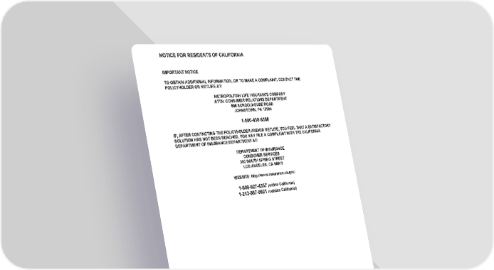 NOTICE FOR RESIDENTS OF CALIFORNIA GCERT2000 7 notice/ca IMPORTANT NOTICE TO OBTAIN ADDITIONAL INFORMATION, OR TO MAKE A COMPLAINT, CONTACT THE POLICYHOLDER OR METLIFE AT: METROPOLITAN LIFE INSURANCE COMPANY ATTN: CONSUMER RELATIONS DEPARTMENT 500 SCHOOLHOUSE ROAD JOHNSTOWN, PA 15904 1-800-438-6388 IF, AFTER CONTACTING THE POLICYHOLDER AND/OR METLIFE, YOU FEEL THAT A SATISFACTORY SOLUTION HAS NOT BEEN REACHED, YOU MAY FILE A COMPLAINT WITH THE CALIFORNIA DEPARTMENT OF INSURANCE DEPARTMENT AT: DEPARTMENT OF INSURANCE CONSUMER SERVICES 300 SOUTH SPRING STREET LOS ANGELES, CA 90013 WEBSITE: http://www.insurance.ca.gov/ 1-800-927-4357 (within California) 1-213-897-8921 (outside California)