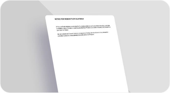NOTICE FOR RESIDENTS OF CALIFORNIA GCERT2000 8 notice/ca If Your certificate includes an exclusion for the voluntary intake or use by any means of any drug, medication or sedative, unless it is taken or used as prescribed by a Physician (or a similar exclusion), We will adjudicate your claim as follows: We will exclude any Covered Loss as a consequence of being under the influence of any intoxicant or controlled substance unless administered on the advice of a Physician.