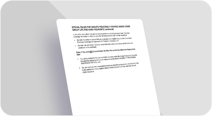 SPECIAL RULES FOR GROUPS PREVIOUSLY COVERED UNDER OTHER GROUP LIFE AND AD&D INSURANCE (continued) GCERT2000 36 tog/life In any other case where You are not Actively at Work on the Replacement Date, Transition Coverage will remain in effect on and after the Replacement Date until the earliest of: ● the date You return to Active Work as a member of an eligible class, at which time Active Employee Coverage will supersede the Transition Coverage; and ● the date Life and AD&D Insurance would otherwise end in accordance with the terms and conditions of this certificate. Rules if You were NOT Covered Under the Prior Plan on the Day Before the Replacement Date: 1. You will be eligible for the Life and AD&D Insurance under this Group Policy when You meet the eligibility requirements for such insurance as described in ELIGIBILITY PROVISIONS: INSURANCE FOR YOU; and 2. We will credit any time accumulated toward any eligibility waiting period under the Prior Plan to the satisfaction of any eligibility Waiting Period required to be met under this Life and AD&D Insurance.
