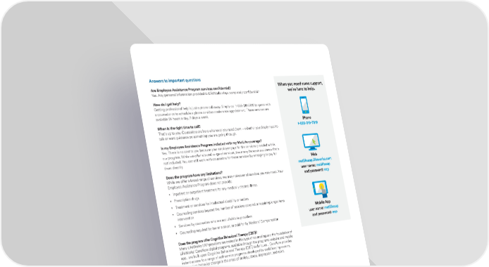 Answers to important questions Are Employee Assistance Program services confidential? When you need some support, Yes. Any personal information provided to LifeWorks stays completely confidential.* we’re here to help. How do I get help? Getting professional help is just a phone call away. Simply call 1-888-319-7819 to speak with a counselor or to schedule a phone or video conference appointment. These services are available 24 hours a day, 7 days a week. When is the right time to call? Phone That’s up to you. Counselors are here whenever you need them —whether you simply need to 1-888-319-7819 talk or want guidance on something you are going through. Is my Employee Assistance Program included with my MetLife coverage? Yes. There is no cost to you because your employer pays for the services provided within our program. While we offer a broad range of services, there may be some assistance that’s not included. You can still work with counselors for these services by arranging to pay for them directly. Web metlifeeap.lifeworks.com Does the program have any limitations? user name: metlifeeap While we offer a broad range of services, we may not cover all services you may need. Your and password: eap Employee Assistance Program does not provide: • Inpatient or outpatient treatment for any medically treated illness • Prescription drugs • Treatment or services for intellectual disability or autism • Counseling services beyond the number of sessions covered or requiring longer term intervention Mobile App • Services by counselors who are not LifeWorks providers user name: metlifeeap • Counseling required by law or a court, or paid for by Workers’ Compensation and password: eap Does the program offer Cognitive Behavioral Therapy (CBT)? Many LifeWorks EAP providers are trained in this type of counseling and the foundation of LifeWorks' CareNow digital programs, available through the programs website and mobile app, are built upon Cognitive Behavioral Therapy (CBT) techniques . CareNow provides instant access to a range of self-service programs developed by world leading experts, focused on behavior change in the areas of anxiety, stress, depression, and more. * MetLife and LifeWorks abide by federal and state regulations regarding duty to warn of harm to self or others. In these instances, the consultant may have a duty to intervene and report a situation to the appropriate authority. Some restrictions may apply to all of these services. Hotline services provided by LifeWorks US Inc. (LifeWorks by Morneau Shepell). LifeWorks is not a subsidiary or affiliate of MetLife. Information disclosed directly to LifeWorks is not disclosed to MetLife, and therefore is not subject to MetLife's privacy policy. Metropolitan Life Insurance Company | 200 Park Avenue | New York, NY 10166 OPT1 L0920007643[exp1121][All States][DC,GU,MP,PR,VI] © 2020 MetLife Services and Solutions, LLC
