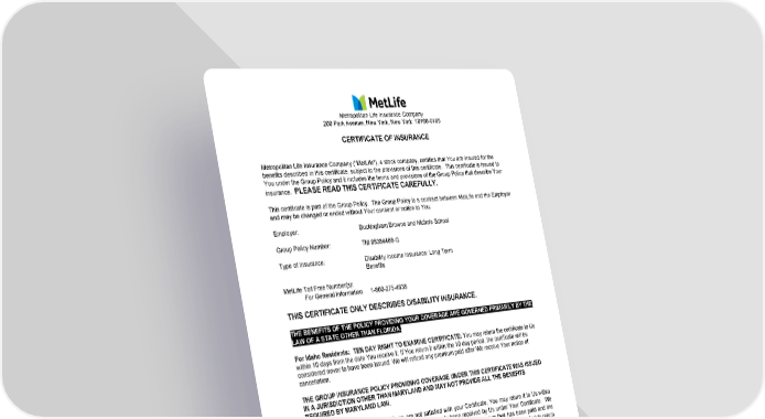 GCERT2000 fp 1 All Active Full-Time Employees NB 5/31/2023 Metropolitan Life Insurance Company 200 Park Avenue, New York, New York 10166-0188 CERTIFICATE OF INSURANCE Metropolitan Life Insurance Company ("MetLife"), a stock company, certifies that You are insured for the benefits described in this certificate, subject to the provisions of this certificate. This certificate is issued to You under the Group Policy and it includes the terms and provisions of the Group Policy that describe Your insurance. PLEASE READ THIS CERTIFICATE CAREFULLY. This certificate is part of the Group Policy. The Group Policy is a contract between MetLife and the Employer and may be changed or ended without Your consent or notice to You. Employer: Buckingham Browne and Nichols School Group Policy Number: TM 05384468 - G Type of Insurance: Disability Income Insurance: Long Term Benefits MetLife Toll Free Number(s): For General Information 1-800-275-4638 THIS CERTIFICATE ONLY DESCRIBES DISABILITY INSURANCE. THE BENEFITS OF THE POLICY PROVIDING YOUR COVERAGE ARE GOVERNED PRIMARILY BY THE LAW OF A STATE OTHER THAN FLORIDA. For Idaho Residents: TEN DAY RIGHT TO EXAMINE CERTIFICATE: You may return the certificate to Us within 10 days from the date You receive it. If You return it within the 10 day period, the certificate will be considered never to have been issued. We will refund any premium paid after We receive Your notice of cancellation. THE GROUP INSURANCE POLICY PROVIDING COVERAGE UNDER THIS CERTIFICATE WAS ISSUED IN A JURISDICTION OTHER THAN MARYLAND AND MAY NOT PROVIDE ALL THE BENEFITS REQUIRED BY MARYLAND LAW. For Residents of North Dakota: If you are not satisfied with your Certificate, You may return it to Us within 20 days after You receive it, unless a claim has previously been received by Us under Your Certificate. We will refund within 30 days of our receipt of the returned Certificate any Premium that has been paid and the Certificate will then be considered to have never been issued. You should be aware that, if you elect to return the Certificate for a refund of premiums, losses which otherwise would have been covered under your Certificate will not be covered. For New Hampshire Residents: 30 Day Right to Examine Certificate. Please read this Certificate. You may return the Certificate to Us within 30 days from the date You receive it. If you return it within the 30 day period, the Certificate will be considered never to have been issued and We will refund any premium paid for insurance under this Certificate. WE ARE REQUIRED BY STATE LAW TO INCLUDE THE NOTICE(S) WHICH APPEAR ON THIS PAGE AND IN THE NOTICE(S) SECTION WHICH FOLLOWS THIS PAGE. PLEASE READ THE(SE) NOTICE(S) CAREFULLY.