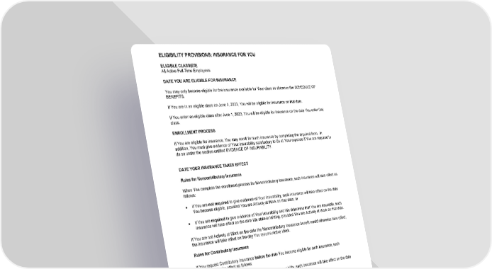 ELIGIBILITY PROVISIONS: INSURANCE FOR YOU GCERT2000 27 e/ee ELIGIBLE CLASS(ES) All Active Full-Time Employees DATE YOU ARE ELIGIBLE FOR INSURANCE You may only become eligible for the insurance available for Your class as shown in the SCHEDULE OF BENEFITS . If You are in an eligible class on June 1, 2023, You will be eligible for insurance on that date. If You enter an eligible class after June 1, 2023, You will be eligible for insurance on the date You enter that class. ENROLLMENT PROCESS If You are eligible for insurance, You may enroll for such insurance by completing the required form. In addition, You must give evidence of Your insurability satisfactory to Us at Your expense if You are required to do so under the section entitled EVIDENCE OF INSURABILITY. DATE YOUR INSURANCE TAKES EFFECT Rules for Noncontributory Insurance When You complete the enrollment process for Noncontributory Insurance, such insurance will take effect as follows: · if You are not required to give evidence of Your insurability, such insurance will take effect on the date You become eligible, provided You are Actively at Work on that date; or · if You are required to give evidence of Your insurability and We determine that You are insurable, such insurance will take effect on the date We state in Writing, provided You are Actively at Work on that date. If You are not Actively at Work on the date the Noncontributory Insurance benefit would otherwise take effect, the insurance will take effect on the day You resume Active Work. Rules for Contributory Insurance If You request Contributory Insurance before the date You become eligible for such insurance, such insurance will take effect as follows: · if You are not required to give evidence of Your insurability, such insurance will take effect on the date You become eligible, provided You are Actively at Work on that date. · if You are required to give evidence of Your insurability and We determine that You are insurable, such insurance will take effect on the date We state in Writing, provided You are Actively at Work on that date. If You request Contributory Insurance within 31 days of the date You become eligible for such insurance, such insurance will take effect as follows: · if You are not required to give evidence of Your insurability, such insurance will take effect on the later of: the date You become eligible for such insurance; and the date You enroll provided You are Actively at Work on that date. · if You are required to give evidence of Your insurability and We determine that You are insurable, such insurance will take effect on the date We state in Writing, provided You are Actively at Work on that date. If You request Contributory Disability Income Insurance more than 31 days after the date You become eligible for such insurance, You must give evidence of Your insurability satisfactory to us. You must give such
