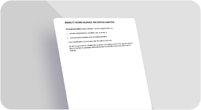 DISABILITY INCOME INSURANCE: PRE-EXISTING CONDITIONS GCERT2000 di/pre-ex 45 Pre-existing Condition means a Sickness or accidental injury for which You: · received medical treatment, consultation, care, or services; or · took prescription medication or had medications prescribed; in the 3 months before Your insurance under this certificate takes effect. We will not pay benefits for a Disability that results from a Pre-existing Condition, if You have been Actively at Work for less than 12 consecutive months after the date Your Disability insurance takes effect under this certificate.