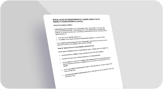 SPECIAL RULES FOR GROUPS PREVIOUSLY INSURED UNDER A PLAN OF DISABILITY INCOME INSURANCE (continued) GCERT2000 tog 31 Rules for Pre-existing Conditions In determining whether a Disability is due to a Pre-existing Condition, We will credit You for any time You were insured under the Prior Plan. If Your Disability is due to a Pre-existing Condition as described in this certificate, but would not have been due to a pre-existing condition under the Prior Plan, We will pay a benefit equal to the lesser of: · the benefit amount under this certificate; and · the disability income insurance benefit that would have been payable to You under the Prior Plan. If Your Disability would have been due to a pre-existing condition under the Prior Plan, it will be treated as having been caused by a Pre-existing Condition under this certificate. Rules for Temporary Recovery from a Disability under the Prior Plan We will waive the Elimination Period that would otherwise apply to a Disability under this certificate if You: · received benefits for a disability that began under the Prior Plan (“Prior Plan’s disability”); · returned to work as an active full-time employee prior to the Replacement Date; · become Disabled, as defined in this certificate, after the Replacement Date and within 90 days of Your return to work due to a sickness or accidental injury that is the same as or related to the Prior Plan’s disability; · are no longer entitled to benefit payments for the Prior Plan’s disability since You are no longer insured under such Plan; and · would have been entitled to benefit payments with no further elimination period under the Prior Plan, had it remained in force.