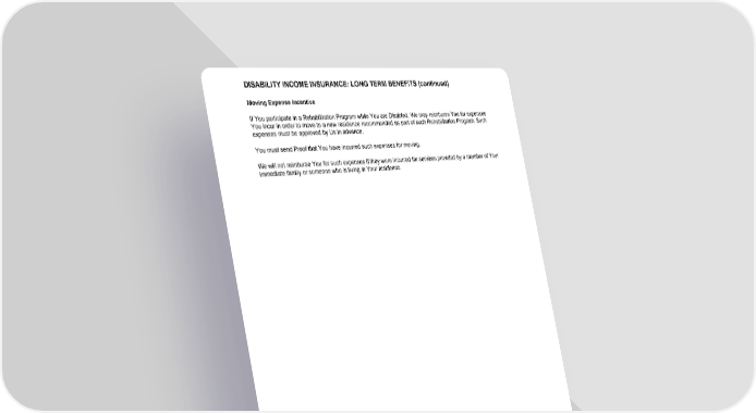 DISABILITY INCOME INSURANCE: LONG TERM BENEFITS (continued) GCERT2000 di/ltd 36 Moving Expense Incentive If You participate in a Rehabilitation Program while You are Disabled, We may reimburse You for expenses You incur in order to move to a new residence recommended as part of such Rehabilitation Program. Such expenses must be approved by Us in advance. You must send Proof that You have incurred such expenses for moving. We will not reimburse You for such expenses if they were incurred for services provided by a member of Your immediate family or someone who is living in Your residence.