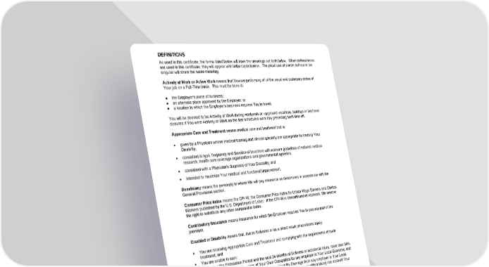 DEFINITIONS GCERT2000 23 def As used in this certificate, the terms listed below will have the meanings set forth below. When defined terms are used in this certificate, they will appear with initial capitalization. The plural use of a term defined in the singular will share the same meaning. Actively at Work or Active Work means that You are performing all of the usual and customary duties of Your job on a Full-Time basis. This must be done at: ● the Employer’s place of business; ● an alternate place approved by the Employer; or ● a location to which the Employer’s business requires You to travel. You will be deemed to be Actively at Work during weekends or -approved vacations, holidays or business closures if You were Actively at Work on the last scheduled work day preceding such time off. Appropriate Care and Treatment means medical care and treatment that is: · given by a Physician whose medical training and clinical specialty are appropriate for treating Your Disability; · consistent in type, frequency and duration of treatment with relevant guidelines of national medical research, health care coverage organizations and governmental agencies; · consistent with a Physician’s diagnosis of Your Disability; and · intended to maximize Your medical and functional improvement. Beneficiary means the person(s) to whom We will pay insurance as determined in accordance with the General Provisions section. Consumer Price Index means the CPI-W, the Consumer Price Index for Urban Wage Earners and Clerical Workers published by the U.S. Department of Labor. If the CPI-W is discontinued or replaced, We reserve the right to substitute any other comparable index. Contributory Insurance means insurance for which the Employer requires You to pay any part of the premium. Disabled or Disability means that, due to Sickness or as a direct result of accidental injury: · You are receiving Appropriate Care and Treatment and complying with the requirements of such treatment; and · You are unable to earn: · during the Elimination Period and the next 24 months of Sickness or accidental injury, more than 80% of Your Predisability Earnings at Your Own Occupation for any employer in Your Local Economy; and · after such period, more than 60% of Your Predisability Earnings from any employer in Your Local Economy at any gainful occupation for which You are reasonably qualified taking into account Your training, education and experience. For purposes of determining whether a Disability is the direct result of an accidental injury, the Disability must have occurred within 90 days of the accidental injury and resulted from such injury independent of other causes. If Your occupation requires a license, the fact that You lose Your license for any reason will not, in itself, constitute Disability. If You are Disabled and have received a Monthly Benefit for 12 months, We will adjust Your Predisability Earnings only for the purposes of determining whether You continue to be Disabled and for calculating the Return to Work Incentive, if any. We will make the initial adjustment as follows: