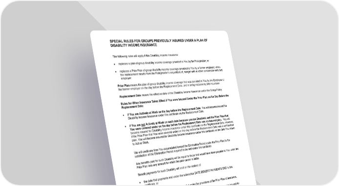 SPECIAL RULES FOR GROUPS PREVIOUSLY INSURED UNDER A PLAN OF DISABILITY INCOME INSURANCE GCERT2000 tog 30 The following rules will apply if this Disability Income Insurance : · replaces a plan of group disability income coverage provided to You by the Policyholder; or · replaces a Prior Plan of group disability income coverage provided to You by a former employer; when the replacement results from the Policyholder’s acquisition of, merger with or other combination with that employer. Prior Plan means the plan of group disability income coverage that was provided to You by the Employer or the former employer on the day before the Replacement Date, and is being replaced by this insurance. Replacement Date means the effective date of the Disability Income Insurance under the Group Policy. Rules for When Insurance Takes Effect if You were Insured Under the Prior Plan on the Day Before the Replacement Date: · If You are Actively at Work on the day before the Replacement Date , You will become insured for Disability Income Insurance under this certificate on the Replacement Date. · If You are not Actively at Work on such date because you are Disabled, and the Prior Plan that You were covered under on the day before the Replacement Date was an insured plan. You will become insured for Disability Income Insurance under this certificate on the Replacement Date. However, if the Prior Plan that You were covered under on the day before the Replacement Date was a self-funded plan, You will become insured for Disability Income Insurance under this certificate on the date You return to Active Work. We will credit any time You accumulated toward the Elimination Period under the Prior Plan to the satisfaction of the Elimination Period required to be met under this certificate Any benefits paid for such Disability will be equal to those that would have been payable to You under the Prior Plan less any amount for which the prior carrier is liable. Benefit payments for such Disability will end on the earliest of: the date that payments end under the subsection DATE BENEFIT PAYMENTS END in this certificate; or the date that payments would have ended under the provisions of the Prior Plan of insurance. · If You are not Actively at Work on such date for any other reason, You will become insured for Disability Income Insurance under this certificate on the date You return to Active Work, provided however, if You are on a Policyholder approved leave of absence on the Replacement Date. You will become insured for Disability Income Insurance on the Replacement Date. However, Your insurance under this certificate will end on the date Your approved leave of absence ends if You do not return to Active Work on such date. Rules for When Insurance Takes Effect if You were Not Insured Under the Prior Plan on the Day Before the Replacement Date : · You will be eligible for Disability Income Insurance under this certificate when you meet the eligibility requirements for such insurance as described in ELIGIBILITY PROVISIONS: INSURANCE FOR YOU; and · We will credit any time You accumulated under the Prior Plan toward the eligibility waiting period under the Prior Plan to the satisfaction of the eligibility waiting period required to be met under this certificate.