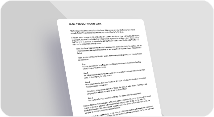 FILING A DISABILITY INCOME CLAIM GCERT2000 48 dis claim The Employer should have a supply of claim forms. Obtain a claim form from the Employer and fill it out carefully. Return the completed claim form with the required Proof to the Employer. If You are unable to report for Active Work due to a Sickness or accidental injury, and You think that You may be Disabled, You should contact MetLife or Your benefits representative to initiate a claim. We recommend that You do so no later than 30 days after the first day You are unable to report for Active Work so that Your claim can be processed in a timely manner. When You file an initial claim for Disability Income insurance benefits described in this certificate, both the notice of claim and the required Proof should be sent to us within 90 days after the end of the Elimination Period. Notice of claim and Proof for Disability Income Insurance may also be given to Us by following the steps set forth below: Step 1 You may give Us notice by calling Us at the toll free number shown in the Certificate Face Page within 20 days of the date of a loss. Step 2 We will send a claim form to You and explain how to complete it. You should receive the claim form within 15 days of giving Us notice of claim. Step 3 When You receive the claim form, You should fill it out as instructed and return it with the required Proof described in the claim form. If You do not receive a claim form within 15 days after giving Us notice of claim, Proof may be sent using any form sufficient to provide Us with the required Proof. Step 4 You must give Us Proof not later than 90 days after the end of the Elimination Period. If notice of claim or Proof is not given within the time limits described in this section, the delay will not cause a claim to be denied or reduced if such notice and Proof are given within 90 days after the end of the Elimination Period or if it is not reasonably possible to give notice of claim or Proof within such period, they are given as soon as is reasonably possible thereafter. Time Limit on Legal Actions . A legal action on a claim may only be brought against Us during a certain period. This period begins 60 days after the date Proof is filed and ends 3 years after the date such Proof is required.