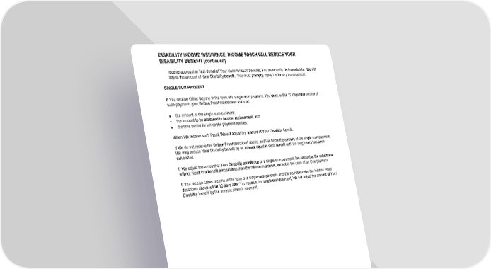 DISABILITY INCOME INSURANCE: INCOME WHICH WILL REDUCE YOUR DISABILITY BENEFIT (continued) GCERT2000 39 di/red as amended by GCR13-22 receive approval or final denial of Your claim for such benefits, You must notify Us immediately. We will adjust the amount of Your Disability benefit. You must promptly repay Us for any overpayment. SINGLE SUM PAYMENT If You receive Other Income in the form of a single sum payment, You must, within 10 days after receipt of such payment, give Written Proof satisfactory to Us of: · the amount of the single sum payment; · the amount to be attributed to income replacement; and · the time period for which the payment applies. When We receive such Proof, We will adjust the amount of Your Disability benefit. If We do not receive the Written Proof described above, and We know the amount of the single sum payment, We may reduce Your Disability benefit by an amount equal to such benefit until the single sum has been exhausted. If We adjust the amount of Your Disability benefit due to a single sum payment, the amount of the adjustment will not result in a benefit amount less than the minimum amount, except in the case of an Overpayment. If You receive Other Income in the form of a single sum payment and We do not receive the Written Proof described above within 10 days after You receive the single sum payment, We will adjust the amount of Your Disability benefit by the amount of such payment.