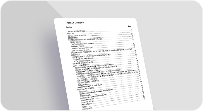 TABLE OF CONTENTS GCERT2000 toc 20 Section Page CERTIFICATE FACE PAGE ............................................................................................................................... 1 NOTICES ............................................................................................................................................................ 2 SCHEDULE OF BENEFITS .............................................................................................................................. 21 DEFINITIONS .................................................................................................................................................... 23 ELIGIBILITY PROVISIONS: INSURANCE FOR YOU ...................................................................................... 27 Eligible Classes ............................................................................................................................................. 27 Date You Are Eligible For Insurance ............................................................................................................. 27 Enrollment Process ........................................................................................................................................ 27 Date Your Insurance Takes Effect ................................................................................................................. 27 Date Your Insurance Ends ............................................................................................................................. 28 SPECIAL RULES FOR GROUPS PREVIOUSLY INSURED UNDER A PLAN OF DISABILITY INCOME INSURANCE ..................................................................................................................................................... 30 CONTINUATION OF INSURANCE WITH PREMIUM PAYMENT .................................................................... 32 For Family And Medical Leave ...................................................................................................................... 32 At The Employer's Option .............................................................................................................................. 32 EVIDENCE OF INSURABILITY ........................................................................................................................ 33 LONG TERM BENEFITS .................................................................................................................................. 34 INCOME WHICH WILL REDUCE YOUR DISABILITY BENEFIT .................................................................. 37 INCOME WHICH WILL NOT REDUCE YOUR DISABILITY BENEFIT ......................................................... 40 DATE BENEFIT PAYMENTS END ................................................................................................................ 41 ADDITIONAL LONG TERM BENEFIT: COST OF LIVING ADJUSTMENT ................................................... 42 ADDITIONAL LONG TERM BENEFIT: SINGLE SUM PAYMENT IN THE EVENT OF YOUR DEATH ........ 43 ADDITIONAL LONG TERM BENEFIT: ALTERNATIVE BENEFIT PAYMENT OFFER, AT OUR OPTION .. 44 PRE-EXISTING CONDITIONS ...................................................................................................................... 45 LIMITED DISABILITY BENEFITS .................................................................................................................. 46 EXCLUSIONS ................................................................................................................................................ 47 FILING A DISABILITY INCOME CLAIM ............................................................................................................ 48 GENERAL PROVISIONS .................................................................................................................................. 49 Assignment .................................................................................................................................................... 49 Disability Income Benefit Payments: Who We Will Pay ................................................................................. 49 Entire Contract ............................................................................................................................................... 49 Incontestability: Statements Made By You .................................................................................................... 49 Misstatement of Age ...................................................................................................................................... 49 Conformity with Law ...................................................................................................................................... 49 Physical Exams ............................................................................................................................................. 50 Autopsy .......................................................................................................................................................... 50 Overpayments ............................................................................................................................................... 50