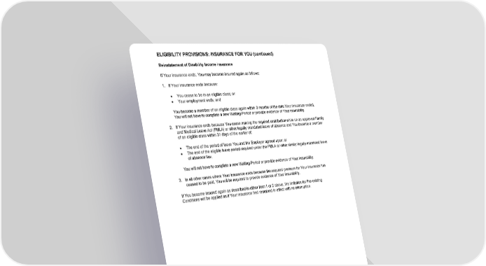 ELIGIBILITY PROVISIONS: INSURANCE FOR YOU (continued) GCERT2000 29 e/ee Reinstatement of Disability Income Insurance If Your insurance ends, You may become insured again as follows: 1. If Your insurance ends because: · You cease to be in an eligible class; or · Your employment ends; and You become a member of an eligible class again within 3 months of the date Your insurance ended, You will not have to complete a new Waiting Period or provide evidence of Your insurability. 2. If Your insurance ends because You cease making the required contribution while on an approved Family and Medical Leave Act (FMLA) or other legally mandated leave of absence and You become a member of an eligible class within 31 days of the earlier of: · The end of the period of leave You and the Employer agreed upon; or · The end of the eligible leave period required under the FMLA or other similar legally mandated leave of absence law, You will not have to complete a new Waiting Period or provide evidence of Your insurability. 3. In all other cases where Your insurance ends because the required premium for Your insurance has ceased to be paid, You will be required to provide evidence of Your insurability. If You become insured again as described in either item 1 or 2 above, the limitation for Pre-existing Conditions will be applied as if Your insurance had remained in effect with no interruption.