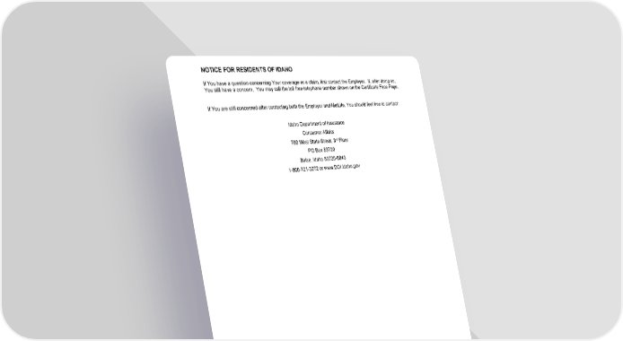NOTICE FOR RESIDENTS OF IDAHO GCERT2000 7 notice/id If You have a question concerning Your coverage or a claim, first contact the Employer. If, after doing so, You still have a concern, You may call the toll free telephone number shown on the Certificate Face Page. If You are still concerned after contacting both the Employer and MetLife, You should feel free to contact: Idaho Department of Insurance Consumer Affairs 700 West State Street, 3 rd Floor PO Box 83720 Boise, Idaho 83720-0043 1-800-721-3272 or www.DOI.Idaho.gov