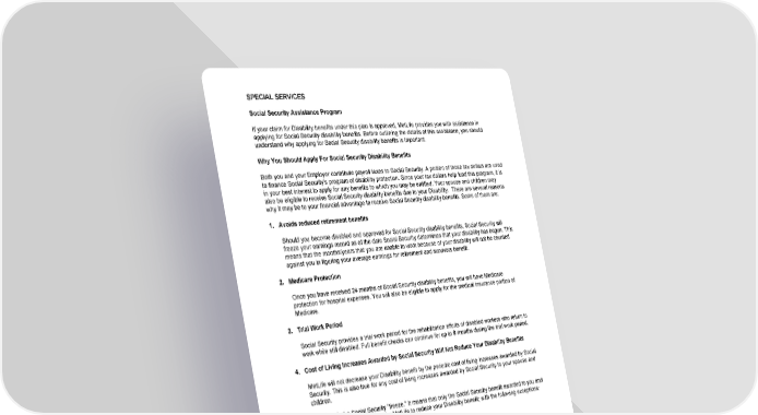 SPECIAL SERVICES Social Security Assistance Program If your claim for Disability benefits under this plan is approved, MetLife provides you with assistance in applying for Social Security disability benefits. Before outlining the details of this assistance, you should understand why applying for Social Security disability benefits is important. Why You Should Apply For Social Security Disability Benefits Both you and your Employer contribute payroll taxes to Social Security. A portion of those tax dollars are used to finance Social Security's program of disability protection. Since your tax dollars help fund this program, it is in your best interest to apply for any benefits to which you may be entitled. Your spouse and children may also be eligible to receive Social Security disability benefits due to your Disability. There are several reasons why it may be to your financial advantage to receive Social Security disability benefits. Some of them are: 1. Avoids reduced retirement benefits Should you become disabled and approved for Social Security disability benefits, Social Security will freeze your earnings record as of the date Social Security determines that your disability has begun. This means that the months/years that you are unable to work because of your disability will not be counted against you in figuring your average earnings for retirement and survivors benefit. 2. Medicare Protection Once you have received 24 months of Social Security disability benefits, you will have Medicare protection for hospital expenses. You will also be eligible to apply for the medical insurance portion of Medicare. 3. Trial Work Period Social Security provides a trial work period for the rehabilitation efforts of disabled workers who return to work while still disabled. Full benefit checks can continue for up to 9 months during the trial work period. 4. Cost of Living Increases Awarded by Social Security Will Not Reduce Your Disability Benefits MetLife will not decrease your Disability benefit by the periodic cost of living increases awarded by Social Security. This is also true for any cost of living increases awarded by Social Security to your spouse and children. This is called a Social Security "freeze." It means that only the Social Security benefit awarded to you and your dependents will be used by MetLife to reduce your Disability benefit; with the following exceptions: a) an error by Social Security in computing the initial amount; b) a change in dependent status; or c) your Employer submitting updated earnings records to Social Security for earnings received prior to your Disability. Over a period of years, the net effect of these cost of living increases can be substantial. How MetLife Assists You in the Social Security Approval Process As soon as you apply for Disability benefits, MetLife begins assisting you with the Social Security approval process. 1. Assistance Throughout the Application Process MetLife has a dedicated team of Social Security Specialists. These Specialists, many of whom have worked for the Social Security Administration, are also located within our Claim Department. They provide