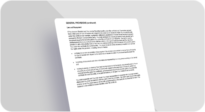GENERAL PROVISIONS (continued) GCERT2000 51 gp 10/04 Lien and Repayment If You become Disabled and You receive Disability benefits under this certificate and You receive payment from a third party for loss of income with respect to the same loss of income for which You received benefits under this certificate (for example, a judgment, settlement, payment from Federal Social Security or payment pursuant to Workers’ Compensation laws), You shall reimburse Us from the proceeds of such payment up to an amount equal to the benefits paid to You under this certificate for such Disability. Our right to receive reimbursement from any such proceeds shall be a claim or lien against such proceeds and Our right shall provide Us with a first priority claim or lien over any such proceeds up to the full amount of the benefits paid to You under this certificate for such Disability. You agree to take all action necessary to enable Us to exercise Our rights under this provision, including, without limitation: · notifying Us as soon as possible of any payment You receive or are entitled to receive from a third party for loss of income with respect to the same loss of income for which You received benefits under this certificate; · furnishing of documents and other information as requested by Us or any person working on Our behalf; and · holding in escrow, or causing Your legal representative to hold in escrow, any proceeds paid to You or any party by a third party for loss of income with respect to the same loss of income for which You received benefits under this certificate, up to an amount equal to the benefits paid to You under this certificate for such Disability, to be paid immediately to Us upon Your receipt of said proceeds. You shall cooperate and You shall cause Your legal representative to cooperate with Us in any recovery efforts and You shall not interfere with Our rights under this provision. Our rights under this provision apply whether or not You have been or will be fully compensated by a third party for any Disability for which You received or are entitled to receive benefits under this certificate.