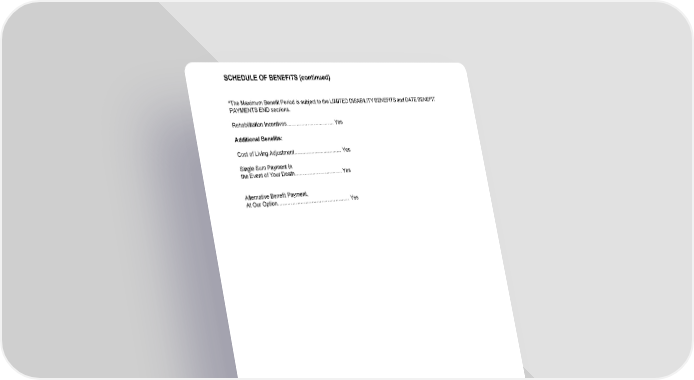 SCHEDULE OF BENEFITS (continued) GCERT2000 sch 22 *The Maximum Benefit Period is subject to the LIMITED DISABILITY BENEFITS and DATE BENEFIT PAYMENTS END sections. Rehabilitation Incentives.............................. Yes Additional Benefits: Cost of Living Adjustment .................................... Yes Single Sum Payment in the Event of Your Death.............................. Yes Alternative Benefit Payment, At Our Option............................................. Yes