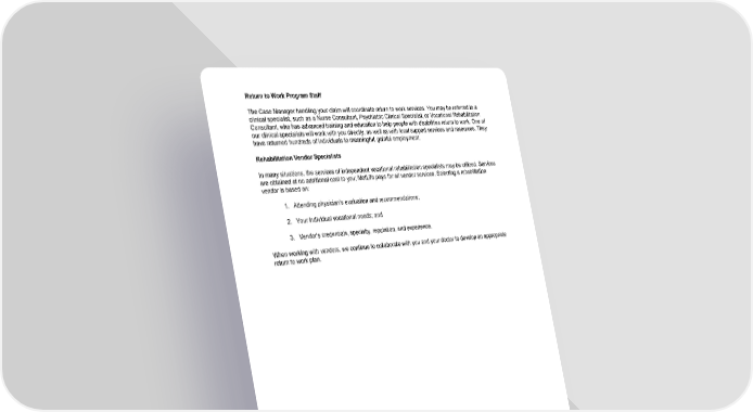 Return to Work Program Staff The Case Manager handling your claim will coordinate return to work services. You may be referred to a clinical specialist, such as a Nurse Consultant, Psychiatric Clinical Specialist, or Vocational Rehabilitation Consultant, who has advanced training and education to help people with disabilities return to work. One of our clinical specialists will work with you directly, as well as with local support services and resources. They have returned hundreds of individuals to meaningful, gainful employment. Rehabilitation Vendor Specialists In many situations, the services of independent vocational rehabilitation specialists may be utilized. Services are obtained at no additional cost to you; MetLife pays for all vendor services. Selecting a rehabilitation vendor is based on: 1. Attending physician's evaluation and recommendations; 2. Your individual vocational needs; and 3. Vendor's credentials, specialty, reputation, and experience. When working with vendors, we continue to collaborate with you and your doctor to develop an appropriate return to work plan.