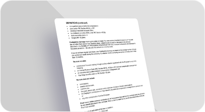 DEFINITIONS (continued) GCERT2000 25 def · non-qualified plans of deferred compensation; · plans under IRC Section 401(k) or 457; · individual retirement accounts (IRA); · tax sheltered annuities (TSA) under IRC Section 403(b); · stock ownership plans; or · Keogh (HR-10) plans. Predisability Earnings means gross salary or wages You were earning from the Employer as of Your last day of Active Work before Your Disability began, subject to any increase or decrease in insurance as described in the ELIGIBILITY PROVISIONS: INSURANCE FOR YOU, Increase in Insurance and Decrease in Insurance provisions. We calculate this amount on a monthly basis. If you do not have regular work hours, your Predisability Earnings are based on the average number of hours you worked per month during the preceding 12 calendar months (or during your period of employment if less than 12 months). The term includes: · contributions You were making through a salary reduction agreement with the Employer to any of the following: · an Internal Revenue Code (IRC) Section 401(k), 403(b) or 457 deferred compensation arrangement; · an executive non-qualified deferred compensation arrangement; and · Your fringe benefits under an IRC Section 125 plan. The term does not include: · commissions; · awards and bonuses; · overtime pay; · the grant, award, sale, conversion and/or exercise of shares of stock or stock options; · the Employer’s contributions on Your behalf to any deferred compensation arrangement or pension plan; or · any other compensation from the Employer. Proof means Written evidence satisfactory to Us that a person has satisfied the conditions and requirements for any benefit described in this certificate. When a claim is made for any benefit described in this certificate, Proof must establish: · the nature and extent of the loss or condition; · Our obligation to pay the claim; and · the claimant’s right to receive payment. Proof must be provided at the claimant’s expense. Rehabilitation Program means a program that has been approved by Us for the purpose of helping You return to work. It may include, but is not limited to, Your participation in one or more of the following activities: · return to work on a modified basis with a goal of resuming employment for which You are reasonably qualified by training, education, experience and past earnings; · on-site job analysis; · job modification; · training to improve job-seeking skills; · vocational assessment; · short-term skills enhancement; · vocational training; or · restorative therapies to improve functional capacity to return to work. Sickness means illness, disease or pregnancy, including complications of pregnancy.