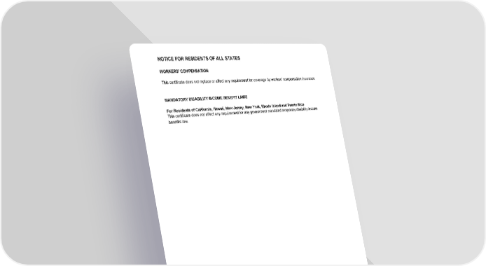 NOTICE FOR RESIDENTS OF ALL STATES GCERT2000 19 notice/wc/nw WORKERS’ COMPENSATION This certificate does not replace or affect any requirement for coverage by workers’ compensation insurance. MANDATORY DISABILITY INCOME BENEFIT LAWS For Residents of California, Hawaii, New Jersey, New York, Rhode Island and Puerto Rico This certificate does not affect any requirement for any government mandated temporary disability income benefits law.