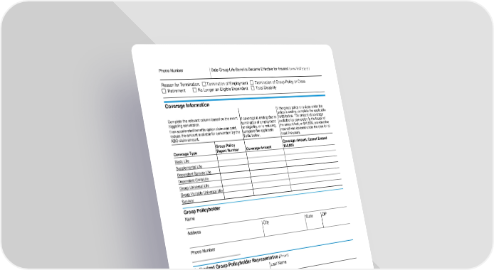 Phone Number Date Group Life Benefits Became Effective for Insured (mm/dd/yyyy) Reason for Termination: Termination of Employment Termination of Group Policy or Class Retirement No Longer an Eligible Dependent Total Disability Coverage Information If the group policy or a class under the Complete the relevant column based on the event policy is ending, complete the applicable triggering conversion. If coverage is ending due to fields below. The amount of coverage termination of employment available for conversion is the lesser of If an accelerated benefits option claim was paid, or eligibility, or is reducing, the amount lost, or $10,000, provided the reduce the amount available for conversion by the complete the applicable insured was covered under the plan for at ABO claim amount. fields below. least five years. Group Policy Coverage Amount. Cannot Exceed Coverage Type Report Number Coverage Amount $10,000 Basic Life Supplemental Life Dependent Spouse Life Dependent Child Life Group Universal Life Group Variable Universal Life Survivor Group Policyholder Name Address City State ZIP Phone Number Authorized Group Policyholder Representative (Print) First Name Last Name G685 Page 2 of 2 NW xCA, MI, MN, NV, NY JY2662.SCRE (06/20) Fs/f