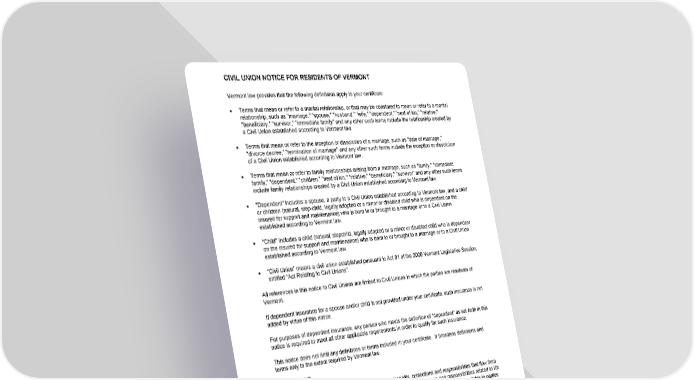 CIVIL UNION NOTICE FOR RESIDENTS OF VERMONT GCERT2000 notice/vt 19 Vermont law provides that the following definitions apply to your certificate: ● Terms that mean or refer to a marital relationship, or that may be construed to mean or refer to a marital relationship, such as "marriage," "spouse," "husband," "wife," "dependent," "next of kin," "relative," "beneficiary," "survivor," "immediate family" and any other such terms include the relationship created by a Civil Union established according to Vermont law. ● Terms that mean or refer to the inception or dissolution of a marriage, such as "date of marriage," "divorce decree," "termination of marriage" and any other such terms include the inception or dissolution of a Civil Union established according to Vermont law. ● Terms that mean or refer to family relationships arising from a marriage, such as "family," "immediate family," "dependent," "children," "next of kin," "relative," "beneficiary," "survivor" and any other such terms include family relationships created by a Civil Union established according to Vermont law. ● "Dependent" includes a spouse, a party to a Civil Union established according to Vermont law, and a child or children (natural, step-child, legally adopted or a minor or disabled child who is dependent on the insured for support and maintenance) who is born to or brought to a marriage or to a Civil Union established according to Vermont law. ● "Child" includes a child (natural, stepchild, legally adopted or a minor or disabled child who is dependent on the insured for support and maintenance) who is born to or brought to a marriage or to a Civil Union established according to Vermont law. ● “Civil Union” means a civil union established pursuant to Act 91 of the 2000 Vermont Legislative Session, entitled “Act Relating to Civil Unions”. All references in this notice to Civil Unions are limited to Civil Unions in which the parties are residents of Vermont. If dependent insurance for a spouse and/or child is not provided under your certificate, such insurance is not added by virtue of this notice. For purposes of dependent insurance, any person who meets the definition of “dependent” as set forth in this notice is required to meet all other applicable requirements in order to qualify for such insurance. This notice does not limit any definitions or terms included in your certificate. It broadens definitions and terms only to the extent required by Vermont law. DISCLOSURE: Vermont law grants parties to a Civil Union the same benefits, protections and responsibilities that flow from marriage under state law. However, some or all of the benefits, protections and responsibilities related to life and health insurance that are available to married persons under federal law may not be available to parties to a Civil Union. For example, a federal law, the Employee Retirement Income Security Act of 1974 known as “ERISA”, controls the employer/employee relationship with regard to determining eligibility for enrollment in private employer benefit plans. Because of ERISA, Act 91 does not state requirements pertaining to a private employer’s enrollment of a party to a Civil Union in an ERISA employee benefit plan. However, governmental employers (not federal government) are required to provide life and health benefits to the dependents of a party to a Civil Union if the public employer provides such benefits to dependents of married persons. Federal law also controls group health insurance continuation rights under “COBRA” for employers with 20 or more employees as well as the Internal Revenue Code treatment of insurance premiums. As a result, parties to a Civil Union and their families may or may not have access to certain benefits under this notice and the certificate to which it is attached that derive from federal law. You are advised to seek expert advice to determine your rights under this notice and the certificate to which it is attached.