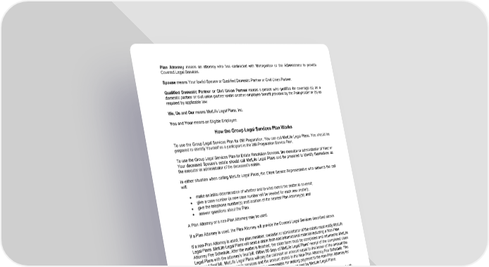 MG WP-ERS 20 CERT 2 Wills, ERS Plan Attorney means an attorney who has contracted with Metropolitan or the Administrator to provide Covered Legal Services. Spouse means Your lawful Spouse or Qualified Domestic Partner or Civil Union Partner. Qualified Domestic Partner or Civil Union Partner means a person who qualifies for coverage (a) as a domestic partner or civil union partner under another employee benefit provided by the Policyholder or (b) as required by applicable law We, Us and Our means MetLife Legal Plans, Inc. You and Your means an Eligible Employee. How the Group Legal Services Plan Works To use the Group Legal Services Plan for Will Preparation, You can call MetLife Legal Plans. You should be prepared to identify Yourself as a participant in the Will Preparation Service Plan. To use the Group Legal Services Plan for Estate Resolution Services, the executor or administrator of Your or Your deceased Spouse’s estate should call MetLife Legal Plans and be prepared to identify themselves as the executor or administrator of the deceased’s estate. In either situation when calling MetLife Legal Plans, the Client Service Representative who answers the call will: make an initial determination of whether and to what extent the matter is covered; give a case number (a new case number will be needed for each new matter); give the telephone number(s) and location of the nearest Plan Attorney(s); and answer questions about the Plan. A Plan Attorney or a non-Plan Attorney may be used. If a Plan Attorney is used, the Plan Attorney will provide the Covered Legal Services described above. If a non-Plan Attorney is used, the plan member, executor or administrator of the estate must notify MetLife Legal Plans. MetLife Legal Plans will send a claim form and informational material including a Non-Plan Attorney Fee Schedule. After the matter is finished, the claim form must be completed and returned to MetLife Legal Plans with the attorney’s final bill. Within 60 days of MetLife Legal Plans' receipt of the completed claim form and final bill, MetLife Legal Plans will pay the claimant an amount equal to the lesser of the amount the claimant paid for the attorney’s services and the amount stated in the Non-Plan Attorney Fee Schedule. The plan member, administrator or executor will be responsible for making payment to the non-Plan Attorney for any expenses or costs and/or fees incurred in excess of the amount paid by MetLife Legal Plans. If a claim is denied in whole or in part, MetLife Legal Plans may be asked to provide a written statement with the reason(s) for the denial and with information as to the steps that need to be taken to appeal the denial.