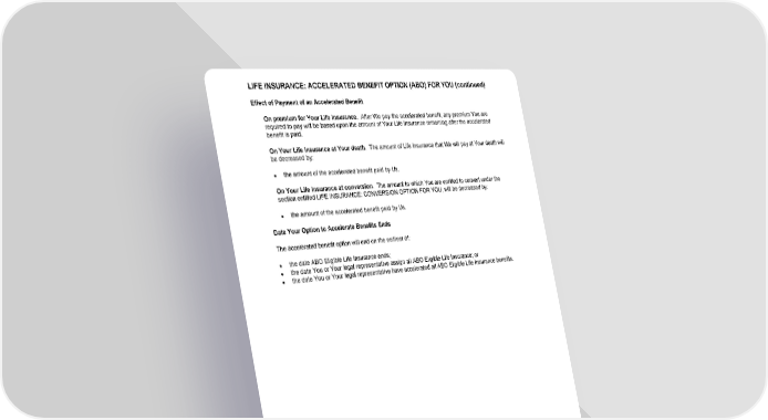 LIFE INSURANCE: ACCELERATED BENEFIT OPTION (ABO) FOR YOU (continued) GCERT2000 abo/ee 10/04 44 Effect of Payment of an Accelerated Benefit On premium for Your Life Insurance. After We pay the accelerated benefit, any premium You are required to pay will be based upon the amount of Your Life Insurance remaining after the accelerated benefit is paid. On Your Life Insurance at Your death . The amount of Life Insurance that We will pay at Your death will be decreased by: ● the amount of the accelerated benefit paid by Us. On Your Life Insurance at conversion . The amount to which You are entitled to convert under the section entitled LIFE INSURANCE: CONVERSION OPTION FOR YOU, will be decreased by: ● the amount of the accelerated benefit paid by Us. Date Your Option to Accelerate Benefits Ends The accelerated benefit option will end on the earliest of: ● the date ABO Eligible Life Insurance ends; ● the date You or Your legal representative assign all ABO Eligible Life Insurance; or ● the date You or Your legal representative have accelerated all ABO Eligible Life Insurance benefits.