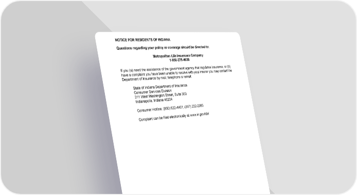NOTICE FOR RESIDENTS OF INDIANA GCERT2000 13 notice/in Questions regarding your policy or coverage should be directed to: Metropolitan Life Insurance Company 1-800-275-4638 If you (a) need the assistance of the government agency that regulates insurance; or (b) have a complaint you have been unable to resolve with your insurer you may contact the Department of Insurance by mail, telephone or email: State of Indiana Department of Insurance Consumer Services Division 311 West Washington Street, Suite 300 Indianapolis, Indiana 46204 Consumer Hotline: (800) 622-4461; (317) 232-2395 Complaint can be filed electronically at www.in.gov/idoi