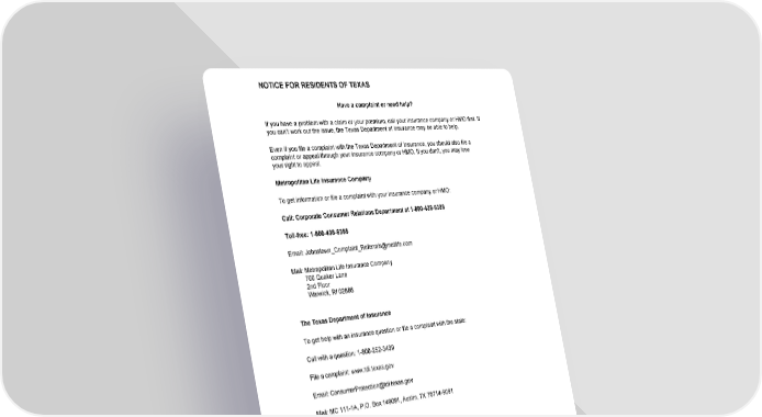 NOTICE FOR RESIDENTS OF TEXAS GCERT-TX-NOTICE 2020 3 Have a complaint or need help? If you have a problem with a claim or your premium, call your insurance company or HMO first. If you can't work out the issue, the Texas Department of Insurance may be able to help. Even if you file a complaint with the Texas Department of Insurance, you should also file a complaint or appeal through your insurance company or HMO. If you don't, you may lose your right to appeal. Metropolitan Life Insurance Company To get information or file a complaint with your insurance company or HMO: Call: Corporate Consumer Relations Department at 1-800-438-6388 Toll-free: 1-800-438-6388 Email: [email protected] Mail: Metropolitan Life Insurance Company 700 Quaker Lane 2nd Floor Warwick, RI 02886 The Texas Department of Insurance To get help with an insurance question or file a complaint with the state: Call with a question: 1-800-252-3439 File a complaint: www.tdi.texas.gov Email: [email protected] Mail: MC 111-1A, P.O. Box 149091, Austin, TX 78714-9091 ¿Tiene una queja o necesita ayuda? Si tiene un problema con una reclamación o con su prima de seguro, llame primero a su compañía de seguros o HMO. Si no puede resolver el problema, es posible que el Departamento de Seguros de Texas (Texas Department of Insurance, por su nombre en inglés) pueda ayudar. Aun si usted presenta una queja ante el Departamento de Seguros de Texas, también debe presentar una queja a través del proceso de quejas o de apelaciones de su compañía de seguros o HMO. Si no lo hace, podría perder su derecho para apelar. Metropolitan Life Insurance Company Para obtener información o para presentar una queja ante su compañía de seguros o HMO: Llame a: Departamento de Relaciones Corporativas del Consumidor al 1-800-438-6388