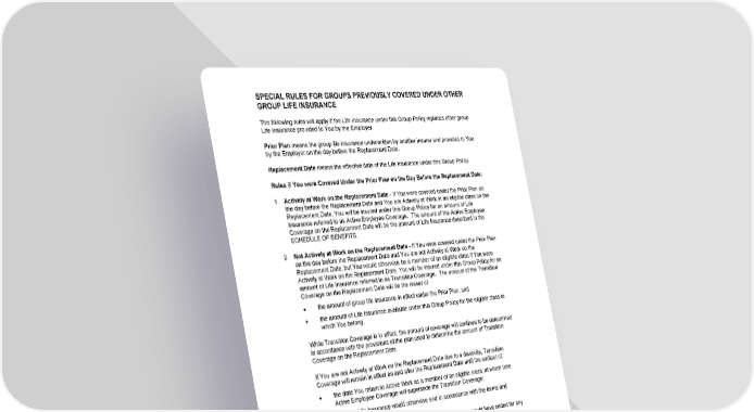 SPECIAL RULES FOR GROUPS PREVIOUSLY COVERED UNDER OTHER GROUP LIFE INSURANCE GCERT2000 35 tog/life The following rules will apply if the Life Insurance under this Group Policy replaces other group Life insurance provided to You by the Employer. Prior Plan means the group life insurance underwritten by another insurer and provided to You by the Employer on the day before the Replacement Date. Replacement Date means the effective date of the Life Insurance under this Group Policy. Rules if You were Covered Under the Prior Plan on the Day Before the Replacement Date: 1. Actively at Work on the Replacement Date - If You were covered under the Prior Plan on the day before the Replacement Date and You are Actively at Work in an eligible class on the Replacement Date, You will be insured under this Group Policy for an amount of Life Insurance referred to as Active Employee Coverage. The amount of the Active Employee Coverage on the Replacement Date will be the amount of Life Insurance described in the SCHEDULE OF BENEFITS. 2. Not Actively at Work on the Replacement Date - If You were covered under the Prior Plan on the day before the Replacement Date and You are not Actively at Work on the Replacement Date, but You would otherwise be a member of an eligible class if You were Actively at Work on the Replacement Date, You will be insured under this Group Policy for an amount of Life Insurance referred to as Transition Coverage. T he amount of the Transition Coverage on the Replacement Date will be the lesser of: ● the amount of group life insurance in effect under the Prior Plan, and ● the amount of Life Insurance available under this Group Policy for the eligible class to which You belong. While Transition Coverage is in effect, the amount of coverage will continue to be determined in accordance with the provisions of the plan used to determine the amount of Transition Coverage on the Replacement Date. If You are not Actively at Work on the Replacement Date due to a disability, Transition Coverage will remain in effect on and after the Replacement Date until the earliest of: ● the date You return to Active Work as a member of an eligible class, at which time Active Employee Coverage will supersede the Transition Coverage; ● the date Life Insurance would otherwise end in accordance with the terms and conditions of this certificate; ● the date on which Your life insurance under the Prior Plan would have ended for any reason other than the Prior Plan ending; ● the date You are approved for extension of life insurance without premium payment under the terms of Prior Plan; and ● if the Prior Plan provided for extension of life insurance without premium payment during a period of disability, the last day of the 12-month period following the Replacement Date.