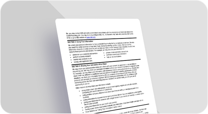 CPN-Initial Enr/SOH and SBR (08/21) Page 2 file, you may contact MIB and seek a correction in accordance with the procedures set forth in the federal Fair Credit Reporting Act. You may do so by writing to MIB, Inc., 50 Braintree Hill, Suite 400, Braintree, MA 02184- 8734 or go to MIB website at www.mib.com . SECTION 5: Using Your Information We collect your personal information to help us decide if you’re eligible for our products or services. We may also need it to verify identities to help deter fraud, money laundering, or other crimes. How we use this information depends on what products and services you have or want from us. It also depends on what laws apply to those products and services. For example, we may also use your information to: · administer your products and services · process claims and other transactions · perform business research · confirm or correct your information · market new products to you · help us run our business · comply with applicable laws SECTION 6: Sharing Your Information With Others We may share your personal information with others with your consent, by agreement, or as permitted or required by law. We may share your personal information without your consent if permitted or required by law. For example, we may share your information with businesses hired to carry out services for us. We may also share it with our affiliated or unaffiliated business partners through joint marketing agreements. In those situations, we share your information to jointly offer you products and services or have others offer you products and services we endorse or sponsor. Before sharing your information with any affiliate or joint marketing partner for their own marketing purposes, however, we will first notify you and give you an opportunity to opt out. Other reasons we may share your information include: doing what a court, law enforcement, or government agency requires us to do (for example, complying with search warrants or subpoenas) telling another company what we know about you if we are selling or merging any part of our business giving information to a governmental agency so it can decide if you are eligible for public benefits giving your information to someone with a legal interest in your assets (for example, a creditor with a lien on your account) giving your information to your health care provider having a peer review organization evaluate your information, if you have health coverage with us those listed in our “Using Your Information” section above SECTION 7: HIPAA We will not share your health information with any other company – even one of our affiliates – for their own marketing purposes. The Health Insurance Portability and Accountability Act (“HIPAA”) protects your information if you request or purchase dental, vision, long-term care and/or medical insurance from us. HIPAA limits our ability to use and disclose the information that we obtain as a result of your request or purchase of insurance. Information about your rights under HIPAA will be provided to you with any dental, vision, long- term care or medical coverage issued to you. You may obtain a copy of our HIPAA Privacy Notice by visiting our website at www.MetLife.com . For additional information about your rights under HIPAA; or to have a HIPAA Privacy Notice mailed to you, contact us at HIPAAprivacyAmericasUS@metlife.com , or call us at telephone number (212) 578-0299. SECTION 8: Accessing and Correcting Your Information You may ask us for a copy of the personal information we have about you. We will provide it as long as it is reasonably locatable and retrievable. You must make your request in writing listing the account or policy numbers with the information you want to access. For legal reasons, we may not show you privileged information relating to a claim or lawsuit, unless required by law.
