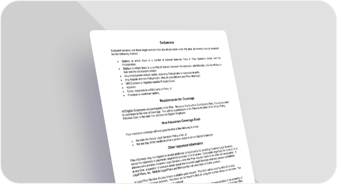 MG WP-ERS 20 CERT 3 Wills, ERS Exclusions Excluded services are those legal services that are not provided under the plan. No services can be provided for the following matters: Matters in which there is a conflict of interest between Your or Your Spouse’s estate and the Policyholder; Matters in which there is a conflict of interest between the executor, administrator, any beneficiary or heir and the deceased’s estate; Any employment-related matter, including Policyholder or statutory benefits; Any dispute with the Policyholder, MetLife and affiliates and Plan Attorneys; Will Contests or litigation outside Probate Court; Appeals; Costs, expenses to a third party or fines; or Frivolous or unethical matters. Requirements for Coverage All Eligible Employees are participants in the Plan. Because this is a Non-Contributory Plan, You do not need to contribute to the cost of coverage. You will be a participant in the Plan on the later of the Group Policy Effective Date or the date You become an Eligible Employee. How Insurance Coverage Ends Your insurance coverage will end upon the first of the following to occur: ● the date the Group Legal Services Policy ends, or ● the last day of the month in which a person cease to be an Eligible Employee. Other Important Information Plan Attorneys may not request or accept additional compensation for providing Covered Legal Services, except for expenses or payments required to be made to third parties. Complaints regarding the conduct of an attorney who provides Covered Legal Services under the Plan may be made to the state bar association. If, at any time, a question or concern arises about the Covered Legal Services received, please call MetLife Legal Plans, Inc. MetLife Legal Plans and Metropolitan will work hard to fix the problem. A Legal Plan Member Survey form is available upon request. This form will be used by MetLife to help evaluate and improve services. This form can be faxed to MetLife using the number shown on the form. The use of the Covered Person’s name is optional. You have the right to complain to the Board of Bar Overseers concerning attorney conduct in the providing of legal services. Complaint procedures and information regarding the process can be obtained from the Office of the Bar Counsel at 99 High Street, Boston, MA 02110, telephone: 617-728-8750. Any dispute or controversy arising between an insurer or sponsor and any attorney, insured, or member, or any person whose insurance certificate contract or membership certificate has been canceled or to whom an insurer or sponsor has refused to issue an insurance certificate contract or membership certificate or between any attorney and an insured or member may, within 30 days after such dispute or controversy arises, make written request to the Massachusetts Division of Insurance commissioner for a hearing thereon. The commissioner or the commissioner’s designee shall hear such party or parties within 30 days after receipt of such request and shall give not less than 15 days written notice of the time and place of the hearing. Such hearing shall be an adjudicatory hearing as defined in MA Gen L ch 30A § 1. Within 30 days after such hearing the commissioner or the commissioner’s designee shall issue a decision thereon. Such hearing may be requested from the Consumer Section of the Division of Insurance at 1000 Washington Street, Suite 810, Boston, MA 02118 through its website, www.mass.gov/doi . Nothing contained in this certificate is intended to interfere with freedom of choice in the selection of an attorney or with the attorney-client relationship.