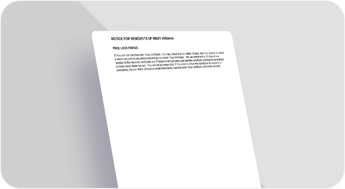 NOTICE FOR RESIDENTS OF WEST VIRGINIA GCERT2000 23 notice/wv FREE LOOK PERIOD: If You are not satisfied with Your certificate, You may return it to Us within 10 days after You receive it, unless a claim has previously been received by Us under Your certificate. We will refund within 10 days of our receipt of the returned certificate any Premium that has been paid and the certificate will then be considered to have never been issued. You should be aware that, if You elect to return the certificate for a refund of premiums, losses which otherwise would have been covered under Your certificate will not be covered.