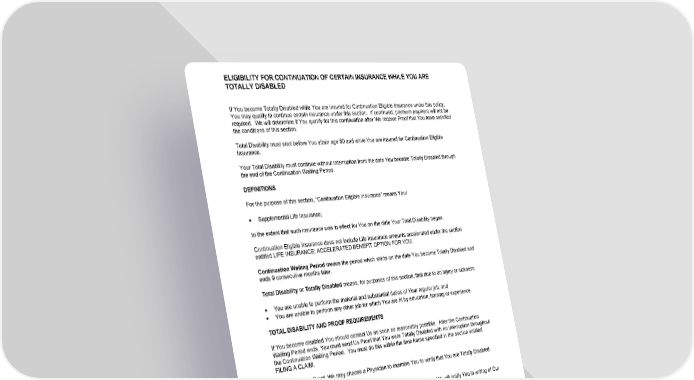 ELIGIBILITY FOR CONTINUATION OF CERTAIN INSURANCE WHILE YOU ARE TOTALLY DISABLED GCERT2000 47 cp/all If You become Totally Disabled while You are insured for Continuation Eligible Insurance under this policy, You may qualify to continue certain insurance under this section. If continued, premium payment will not be required. We will determine if You qualify for this continuation after We receive Proof that You have satisfied the conditions of this section. Total Disability must start before You attain age 60 and while You are insured for Continuation Eligible Insurance. Your Total Disability must continue without interruption from the date You became Totally Disabled through the end of the Continuation Waiting Period. DEFINITIONS For the purpose of this section, “Continuation Eligible Insurance” means Your · Supplemental Life Insurance; to the extent that such insurance was in effect for You on the date Your Total Disability began. Continuation Eligible Insurance does not include Life Insurance amounts accelerated under the section entitled LIFE INSURANCE: ACCELERATED BENEFIT OPTION FOR YOU. Continuation Waiting Period means the period which starts on the date You become Totally Disabled and ends 9 consecutive months later. Total Disability or Totally Disabled means, for purposes of this section, that due to an injury or sickness: · You are unable to perform the material and substantial duties of Your regular job; and · You are unable to perform any other job for which You are fit by education, training or experience. TOTAL DISABILITY AND PROOF REQUIREMENTS If You become disabled You should contact Us as soon as reasonably possible. After the Continuation Waiting Period ends, You must send Us Proof that You were Totally Disabled with no interruption throughout the Continuation Waiting Period. You must do this within the time frame specified in the section entitled FILING A CLAIM. As part of such Proof, We may choose a Physician to examine You to verify that You are Totally Disabled. We will pay for the exam. After We receive and review Your Proof, We will determine if You qualify. We will notify You in writing of Our decision. To verify that You continue to be Totally Disabled without interruption, We may require from time to time that You send Us Proof that You continue to be Totally Disabled. We will not ask for Proof more than once each year. IF YOU DIE DURING CONTINUATION If You die during the continuation, Proof of the death must be sent to Us. In addition to the Proof which is otherwise required for the insurance, the Proof must show that Your Total Disability continued with no interruption from the date We informed You that the continuation was approved until the date of the death. When We receive such Proof with the claim, We will review the claim and if We approve it, will pay any benefit payable under the insurance continued under this section.