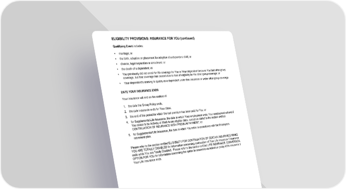 ELIGIBILITY PROVISIONS: INSURANCE FOR YOU (continued) GCERT2000 34 e/ee Qualifying Event includes: Ÿ marriage; or Ÿ the birth, adoption or placement for adoption of a dependent child; or Ÿ divorce, legal separation or annulment; or Ÿ the death of a dependent; or Ÿ You previously did not enroll for life coverage for You or Your dependent because You had other group coverage, but that coverage has ceased due to loss of eligibility for the other group coverage; or Ÿ Your dependent's ceasing to qualify as a dependent under this insurance or under other group coverage. DATE YOUR INSURANCE ENDS Your insurance will end on the earliest of: 1. the date the Group Policy ends; 2 . the date insurance ends for Your class; 3 . the end of the period for which the last premium has been paid for You; or 4. for Supplemental Life Insurance, the date in which Your employment ends; Your employment will end if You cease to be Actively at Work in any eligible class, except as stated in the section entitled CONTINUATION OF INSURANCE WITH PREMIUM PAYMENT; or 5 . for Supplemental Life Insurance, the date in which You retire in accordance with the Employer’s retirement plan. Please refer to the section entitled ELIGIBILITY FOR CONTINUATION OF CERTAIN INSURANCE WHILE YOU ARE TOTALLY DISABLED for information concerning continuation of Your Life Insurance if insurance ends while You are Totally Disabled. Please refer to the section entitled LIFE INSURANCE: CONVERSION OPTION FOR YOU for information concerning the option to convert to an individual policy of life insurance if Your Life Insurance ends.