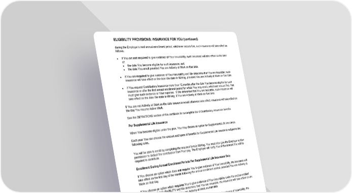 ELIGIBILITY PROVISIONS: INSURANCE FOR YOU (continued) GCERT2000 32 e/ee during the Employer’s next annual enrollment period, whichever occurs first , such insurance will take effect as follows: ● if You are not required to give evidence of Your insurability, such insurance will take effect on the later of: ● the date You become eligible for such insurance; and ● the date You enroll provided You are Actively at Work on that date. ● if You are required to give evidence of Your insurability and We determine that You are insurable, such insurance will take effect on the date We state in Writing, provided You are Actively at Work on that date. ● If You request Contributory Insurance more than 12 months after the date You become eligible for such insurance or after the first annual enrollment period for which You may enroll, whichever occurs first , You must give such evidence at Your expense. If We determine that You are insurable, such insurance will take effect on the date We state in Writing, if You are Actively at Work on that date. If You are not Actively at Work on the date insurance would otherwise take effect, insurance will take effect on the day You resume Active Work. See the DEFINITIONS section of this certificate for a complete list of Contributory Insurance benefits. For Supplemental Life Insurance When You become eligible under the plan, You may choose an option for Supplemental Life Insurance. Each year You can choose the amount and types of benefits for Supplemental Life Insurance subject to the following rules. You will be able to enroll by completing the required form in Writing. You must also give the Employer written permission to deduct the contribution from Your pay. The Employer will notify You of the amount You will be required to contribute. Enrollment During Annual Enrollment Periods For Supplemental Life Insurance Only If You choose an option which does not require You to give evidence of Your insurability, the insurance will take effect on the first day of the month following the annual enrollment period, provided You are Actively at Work on that day . If You choose an option which requires You to give evidence of Your insurability under the section entitled EVIDENCE OF INSURABILITY and We determine that You are insurable, the insurance will take effect on the date We state in Writing, provided You are Actively at Work on that date. · if We do not approve Your evidence of insurability, or You do not submit evidence of insurability, the insurance will not take effect. · if You are required to give evidence of insurability under the section entitled EVIDENCE OF INSURABILITY for a portion of the insurance: · the portion of the insurance that is not subject to evidence of insurability will take effect on the date of Your request. · if We approve Your evidence of insurability, the portion of the insurance that is subject to evidence of insurability will take effect on the date We state in Writing. If We do not approve Your evidence of insurability or You do not submit evidence of insurability, the portion of the insurance that is subject to evidence of insurability will not take effect. If You are not Actively at Work on the date insurance would otherwise take effect, insurance will take effect on the day You resume Active Work. Increase in Insurance