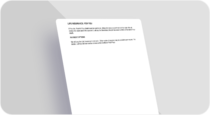 LIFE INSURANCE: FOR YOU GCERT2000 42 l/ee If You die, Proof of Your death must be sent to Us. When We receive such Proof with the claim, We will review the claim and if We approve it, will pay the Beneficiary the Life Insurance in effect on the date of Your death. PAYMENT OPTIONS We will pay the Life Insurance in one sum. Other modes of payment may be available upon request. For details, call Our toll free number shown on the Certificate Face Page.