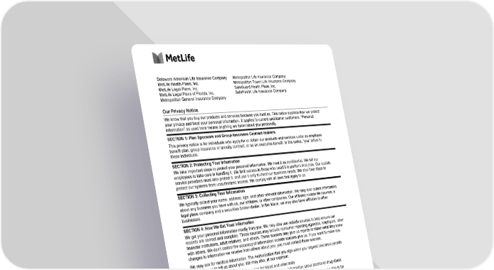 CPN-Initial Enr/SOH and SBR (08/21) Page 1 Delaware American Life Insurance Company MetLife Health Plans, Inc. MetLife Legal Plans, Inc. MetLife Legal Plans of Florida, Inc. Metropolitan General Insurance Company Metropolitan Life Insurance Company Metropolitan Tower Life Insurance Company SafeGuard Health Plans, Inc. SafeHealth Life Insurance Company Our Privacy Notice We know that you buy our products and services because you trust us. This notice explains how we protect your privacy and treat your personal information. It applies to current and former customers. “Personal information” as used here means anything we know about you personally. SECTION 1: Plan Sponsors and Group Insurance Contract Holders This privacy notice is for individuals who apply for or obtain our products and services under an employee benefit plan, group insurance or annuity contract, or as an executive benefit. In this notice, “you” refers to these individuals. SECTION 2: Protecting Your Information We take important steps to protect your personal information. We treat it as confidential. We tell our employees to take care in handling it. We limit access to those who need it to perform their jobs. Our outside service providers must also protect it, and use it only to meet our business needs. We also take steps to protect our systems from unauthorized access. We comply with all laws that apply to us. SECTION 3: Collecting Your Information We typically collect your name, address, age, and other relevant information. We may also collect information about any business you have with us, our affiliates, or other companies. Our affiliates include life insurers, a legal plans company and a securities broker-dealer. In the future, we may also have affiliates in other businesses. SECTION 4: How We Get Your Information We get your personal information mostly from you. We may also use outside sources to help ensure our records are correct and complete. These sources may include consumer reporting agencies, employers, other financial institutions, adult relatives, and others. These sources may give us reports or share what they know with others. We don’t control the accuracy of information outside sources give us. If you want to make any changes to information we receive from others about you, you must contact those sources. We may ask for medical information. The Authorization that you sign when you request insurance permits these sources to tell us about you. We may also, at our expense: · Ask for a medical exam · Ask for blood and urine tests · Ask health care providers to give us health data, including information about alcohol or drug abuse We may also ask a consumer reporting agency for a “consumer report” about you (or anyone else to be insured). Consumer reports may tell us about a lot of things, including information about: · Reputation · Driving record · Finances · Work and work history · Hobbies and dangerous activities The information may be kept by the consumer reporting agency and later given to others as permitted by law. The agency will give you a copy of the report it provides to us, if you ask the agency and can provide adequate identification. If you write to us and we have asked for a consumer report about you, we will tell you so and give you the name, address and phone number of the consumer reporting agency. Another source of information is MIB, Inc. (“MIB”). It is a not-for-profit membership organization of insurance companies which operates an information exchange on behalf of its Members. We, or our reinsurers, may make a brief report to MIB. If you apply to another MIB Member company for life or health insurance coverage, or a claim for benefits is submitted, MIB, upon request, will supply such company with the information in its file. Upon receipt of a request from you MIB will arrange disclosure of any information it may have in your file. Please contact MIB at 866-692-6901. If you question the accuracy of information in MIB’s