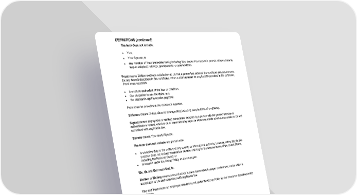 DEFINITIONS (continued) GCERT2000 30 def The term does not include : ● You; ● Your Spouse; or ● any member of Your immediate family including Your and/or Your spouse’s parents; children (natural, step or adopted); siblings; grandparents; or grandchildren. Proof means Written evidence satisfactory to Us that a person has satisfied the conditions and requirements for any benefit described in this certificate. When a claim is made for any benefit described in this certificate, Proof must establish: · the nature and extent of the loss or condition; · Our obligation to pay the claim; and · the claimant’s right to receive payment. Proof must be provided at the claimant’s expense. Sickness means illness, disease or pregnancy, including complications of pregnancy. Signed means any symbol or method executed or adopted by a person with the present intention to authenticate a record, which is on or transmitted by paper or electronic media which is acceptable to Us and consistent with applicable law. Spouse means Your lawful Spouse. The term does not include any person who: ● is on active duty in the military of any country or international authority; however, active duty for this purpose does not include weekend or summer training for the reserve forces of the United States, including the National Guard; or ● is insured under the Group Policy as an employee. We , Us and Our mean MetLife. Written or Writing means a record which is on or transmitted by paper or electronic media which is acceptable to Us and consistent with applicable law. You and Your mean an employee who is insured under the Group Policy for the insurance described in this certificate.