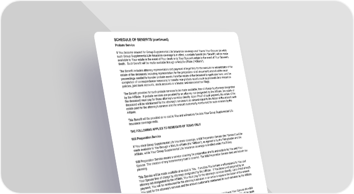 SCHEDULE OF BENEFITS (continued) GCERT2000 27 sch Probate Service If You become insured for Group Supplemental Life Insurance coverage and You or Your Spouse die while such Group Supplemental Life Insurance coverage is in effect, a probate benefit (the “Benefit”) will be made available to Your estate in the event of Your death or to Your Spouse's estate in the event of Your Spouse's death. Such benefit will be made available through a MetLife affiliate (“Affiliate”). The Benefit includes attorney representation and payment of legal fees for the executor or administrator of the estate of the deceased, including representation for the preparation of all documents and all of the court proceedings needed to transfer probate assets from the estate of the deceased to applicable heirs; and the completion of correspondence necessary to transfer non-probate assets such as proceeds from insurance policies, joint bank accounts, stock accounts or a house; and associated tax filings. The Benefit provides for such probate services to be made available, free of charge by attorneys designated by the Affiliate. If probate services are provided by an attorney not designated by the Affiliate, the estate of the deceased must pay for those attorney’s services directly. Upon Proof of such payment, the estate of the deceased will be reimbursed for the attorney’s services in an amount equal to the lesser of the amount such estate paid for the attorney’s services and the amount customarily reimbursed for such services by the Affiliate. This Benefit will be provided at no cost to You and will end on the date Your Group Supplemental Life Insurance coverage ends. THE FOLLOWING APPLIES TO RESIDENTS OF TEXAS ONLY Will Preparation Service If You elect Group Supplemental Life Insurance coverage, a Will Preparation Service (the “Service”) will be made available to You through a MetLife affiliate (the “Affiliate”), as agreed to by the Policyholder and the Affiliate, while Your Group Supplemental Life Insurance coverage is in effect under this Policy. Will Preparation Service means a service covering the preparation of wills and codicils for You and Your Spouse. The creation of any testamentary trust is covered. The Will Preparation Service does not include tax planning. This Service will be made available at no cost to You. It enables You to have a will prepared for You and Your Spouse free of charge by attorneys designated by the Affiliate. If You have a will prepared by an attorney not designated by the Affiliate, You must pay for the attorney’s services directly. Upon Proof of such payment, You will be reimbursed for the attorney’s services in an amount equal to the lesser of the amount You paid for the attorney’s services and the amount customarily reimbursed for such services by the Affiliate. Probate Service If You become insured for Group Supplemental Life Insurance coverage and You or Your Spouse die while such Group Supplemental Life Insurance coverage is in effect, a probate benefit (the “Benefit”) will be made available to Your estate in the event of Your death or to Your Spouse’s estate in the event of Your Spouse’s death. Such benefit will be made available through a MetLife affiliate (“Affiliate”). The Benefit includes attorney representation and payment of legal fees for the executor or administrator of the estate of the deceased including representation for the preparation of all documents and all of the court proceedings needed to transfer probate assets from the estate of the deceased to applicable heirs; and the completion of correspondence necessary to transfer non-probate assets such as proceeds from insurance policies, joint bank accounts, stock accounts or a house; and associated tax filings. The Benefit provides for such services to be made available, free of charge by attorneys designated by the Affiliate. If probate services are provided by an attorney not designated by the Affiliate, the estate of the deceased must pay for those attorney’s services directly. Upon Proof of such payment, the estate of the deceased will be reimbursed for the attorney’s services in an amount equal to the lesser of the amount such estate paid for the attorney’s services and the amount customarily reimbursed for such services by the Affiliate.