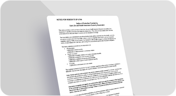 NOTICE FOR RESIDENTS OF UTAH GTY-NOTICE-UT-0710 17 Notice of Protection Provided by Utah Life and Health Insurance Guaranty Association This notice provides a brief summary of the Utah Life and Health Insurance Guaranty Association (“the Association”) and the protection it provides for policyholders. This safety net was created under Utah law, which determines who and what is covered and the amounts of coverage. The Association was established to provide protection in the unlikely event that your life, health, or annuity insurance company becomes financially unable to meet its obligations and is taken over by its insurance regulatory agency. If this should happen, the Association will typically arrange to continue coverage and pay claims, in accordance with Utah law, with funding from assessments paid by other insurance companies. The basic protections provided by the Association are: · Life Insurance o $500,000 in death benefits o $200,000 in cash surrender or withdrawal values · Health Insurance o $500,000 in hospital, medical and surgical insurance benefits o $500,000 in long-term care insurance benefits o $500,000 in disability income insurance benefits o $500,000 in other types of health insurance benefits · Annuities o $250,000 in withdrawal and cash values The maximum amount of protection for each individual, regardless of the number of policies or contracts, is $500,000. Special rules may apply with regard to hospital, medical and surgical insurance benefits. Note: Certain policies and contracts may not be covered or fully covered. For example, coverage does not extend to any portion of a policy or contract that the insurer does not guarantee, such as certain investment additions to the account value of a variable life insurance policy or a variable annuity contract. Coverage is conditioned on residency in this state and there are substantial limitations and exclusions. For a complete description of coverage, consult Utah Code, Title 3 lA, Chapter 28. Insurance companies and agents are prohibited by Utah law to use the existence of the Association or its coverage to encourage you to purchase insurance. When selecting an insurance company, you should not rely on Association coverage. If there is any inconsistency between Utah law and this notice, Utah law will control. To learn more about the above protections, as well as protections relating to group contracts or retirement plans, please visit the Association's website at www.utlifega.org or contact: Utah Life and Health Insurance Guaranty Assoc. Utah Insurance Department 60 East South Temple, Suite 500 3110 State Office Building Salt Lake City UT 84111 Salt Lake City UT 84114-6901 (801) 320-9955 (801) 538-3800 A written complaint about misuse of this Notice or the improper use of the existence of the Association may be filed with the Utah Insurance Department at the above address. ce