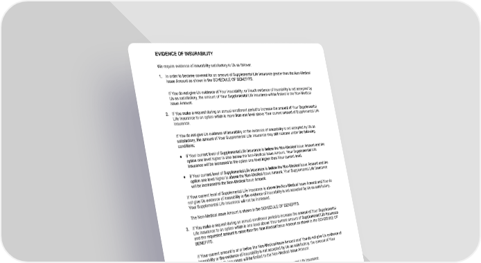 EVIDENCE OF INSURABILITY GCERT2000 40 eoi We require evidence of insurability satisfactory to Us as follows: 1 . In order to become covered for an amount of Supplemental Life Insurance greater than the Non-Medical Issue Amount as shown in the SCHEDULE OF BENEFITS. If You do not give Us evidence of Your insurability, or if such evidence of insurability is not accepted by Us as satisfactory, the amount of Your Supplemental Life Insurance will be limited to the Non-Medical Issue Amount. 2 . If You make a request during an annual enrollment period to increase the amount of Your Supplemental Life Insurance to an option which is more than one level above Your current amount of Supplemental Life Insurance. If You do not give Us evidence of insurability or the evidence of insurability is not accepted by Us as satisfactory, the amount of Your Supplemental Life Insurance may still increase under the following conditions; ● if Your current level of Supplemental Life Insurance is below the Non-Medical Issue Amount and the option one level higher is also below the Non-Medical Issue Amount, Your Supplemental Life Insurance will be increased to the option one level higher than Your current level. ● if Your current level of Supplemental Life Insurance is below the Non-Medical Issue Amount and the option one level higher is above the Non-Medical Issue Amount, Your Supplemental Life Insurance will be increased to the Non-Medical Issue Amount. If Your current level of Supplemental Life Insurance is above the Non-Medical Issue Amount and You do not give Us evidence of insurability or the evidence of insurability is not accepted by Us as satisfactory, Your Supplemental Life Insurance will not be increased. The Non-Medical Issue Amount is shown in the SCHEDULE OF BENEFITS. 3 . If You make a request during an annual enrollment period to increase the amount of Your Supplemental Life Insurance to an option which is one level above Your current amount of Supplemental Life Insurance and the requested amount is more than the Non-Medical Issue Amount as shown in the SCHEDULE OF BENEFITS. If Your current amount is at or below the Non-Medical Issue Amount and You do not give Us evidence of insurability or the evidence of insurability is not accepted by Us as satisfactory, the amount of Your Supplemental Life Insurance will be limited to the Non-Medical Issue Amount. 4 . If You make a request to increase the amount of Your Supplemental Life Insurance. If You do not give Us evidence of insurability or the evidence of insurability is not accepted by Us as satisfactory, the amount of Your Supplemental Life Insurance will not be increased. 5. When You make a late request for Supplemental Life Insurance. A late request is one made more than 12 months after You become eligible or after the Employer’s next annual enrollment period, whichever occurs first. If You do not give Us evidence of insurability or the evidence of insurability is not accepted by Us as satisfactory, You will not be covered for Supplemental Life Insurance. 6 . In the case of transferred business, if You did not elect coverage under the prior plan for which You were eligible. If You do not give Us evidence of insurability or the evidence of insurability is not accepted by Us as satisfactory, You will not be covered for Supplemental Life Insurance.