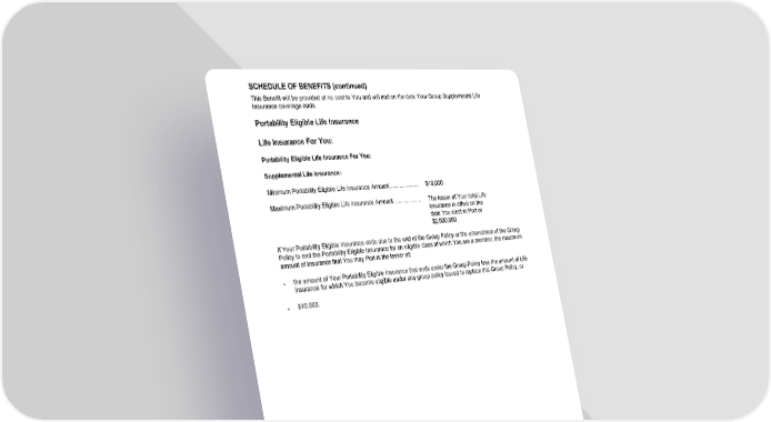 SCHEDULE OF BENEFITS (continued) GCERT2000 28 sch This Benefit will be provided at no cost to You and will end on the date Your Group Supplemental Life Insurance coverage ends. Portability Eligible Life Insurance Life Insurance For You: Portability Eligible Life Insurance For You: Supplemental Life Insurance: Minimum Portability Eligible Life Insurance Amount.................. $10,000 Maximum Portability Eligible Life Insurance Amount................. The lesser of Your total Life Insurance in effect on the date You elect to Port or $2,000,000. If Your Portability Eligible Insurance ends due to the end of the Group Policy or the amendment of the Group Policy to end the Portability Eligible Insurance for an eligible class of which You are a member, the maximum amount of insurance that You may Port is the lesser of: ● the amount of Your Portability Eligible Insurance that ends under the Group Policy less the amount of Life insurance for which You become eligible under any group policy issued to replace this Group Policy; or ● $10,000.