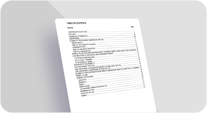 TABLE OF CONTENTS GCERT2000 toc 25 Section Page CERTIFICATE FACE PAGE ............................................................................................................................... 1 NOTICES ............................................................................................................................................................ 3 SCHEDULE OF BENEFITS .............................................................................................................................. 26 DEFINITIONS .................................................................................................................................................... 29 ELIGIBILITY PROVISIONS: INSURANCE FOR YOU ...................................................................................... 31 Eligible Classes ............................................................................................................................................. 31 Date You Are Eligible For Insurance ............................................................................................................. 31 Enrollment Process ........................................................................................................................................ 31 Date Your Insurance Takes Effect ................................................................................................................. 31 Date Your Insurance Ends ............................................................................................................................. 34 SPECIAL RULES FOR GROUPS PREVIOUSLY COVERED UNDER OTHER GROUP LIFE INSURANCE . 35 CONTINUATION OF INSURANCE WITH PREMIUM PAYMENT .................................................................... 37 For Family And Medical Leave ...................................................................................................................... 37 At Your Option: Portability ............................................................................................................................. 37 At The Employer's Option .............................................................................................................................. 38 EVIDENCE OF INSURABILITY ........................................................................................................................ 40 LIFE INSURANCE: FOR YOU .......................................................................................................................... 42 LIFE INSURANCE: ACCELERATED BENEFIT OPTION (ABO) FOR YOU ..................................................... 43 LIFE INSURANCE: CONVERSION OPTION FOR YOU .................................................................................. 45 ELIGIBILITY FOR CONTINUATION OF CERTAIN INSURANCE WHILE YOU ARE TOTALLY DISABLED ... 47 FILING A CLAIM ............................................................................................................................................... 49 GENERAL PROVISIONS .................................................................................................................................. 50 Assignment .................................................................................................................................................... 50 Beneficiary ..................................................................................................................................................... 50 Suicide ........................................................................................................................................................... 50 Entire Contract ............................................................................................................................................... 51 Incontestability: Statements Made By You .................................................................................................... 51 Misstatement of Age ...................................................................................................................................... 51 Conformity with Law ...................................................................................................................................... 51 Autopsy .......................................................................................................................................................... 51
