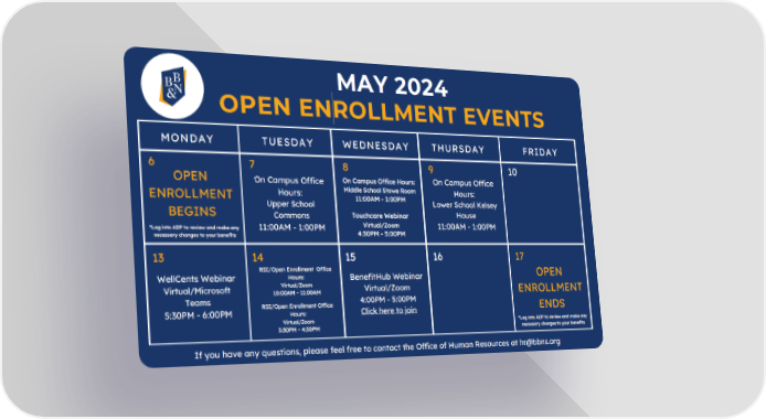 MAY 2024 OPEN ENROLLMENT EVENTS MONDAY TUESDAY WEDNESDAY THURSDAY FRIDAY 0 7 9 6 8 1 On Campus Office Hours: On Campus Office OPEN On Campus Office Middle School Stowe Room Hours: Hours: ENROLLMENT 11:00AM - 1:00PM Lower School Kelsey Upper School House BEGINS Touchcare Webinar Commons Virtual/Zoom 11:00AM - 1:00PM *Log into ADP to review and make any 11:00AM - 1:00PM 4:30PM - 5:00PM necessary changes to your benefits 3 7 5 6 4 1 1 1 1 1 RSI/Open Enrollment Office OPEN Hours: WellCents Webinar BenefitHub Webinar Virtual/Zoom Virtual/Microsoft Virtual/Zoom 10:00AM - 11:00AM ENROLLMENT Teams 4:00PM - 5:00PM RSI/Open Enrollment Office ENDS Click here to join 5:30PM - 6:00PM Hours: Virtual/Zoom *Log into ADP to review and make any 3:30PM - 4:30PM necessary changes to your benefits If you have any questions, please feel free to contact the Office of Human Resources at [email protected]